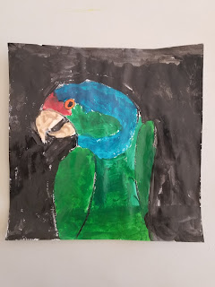 Students were given a calendar page from various calendars that my Mom had saved. We used oil pastel to start drawing the figures of the bird. I gave a brief demo on how to "build a figure" using basic shapes, to start. The body might be an oval, and the head is a circle. From there, you can fine tune the edges of the form. Children were given all 6 colors of the wheel and just went to town paintings their birds. We used Jazz tempura paint which has a glossy finish.
